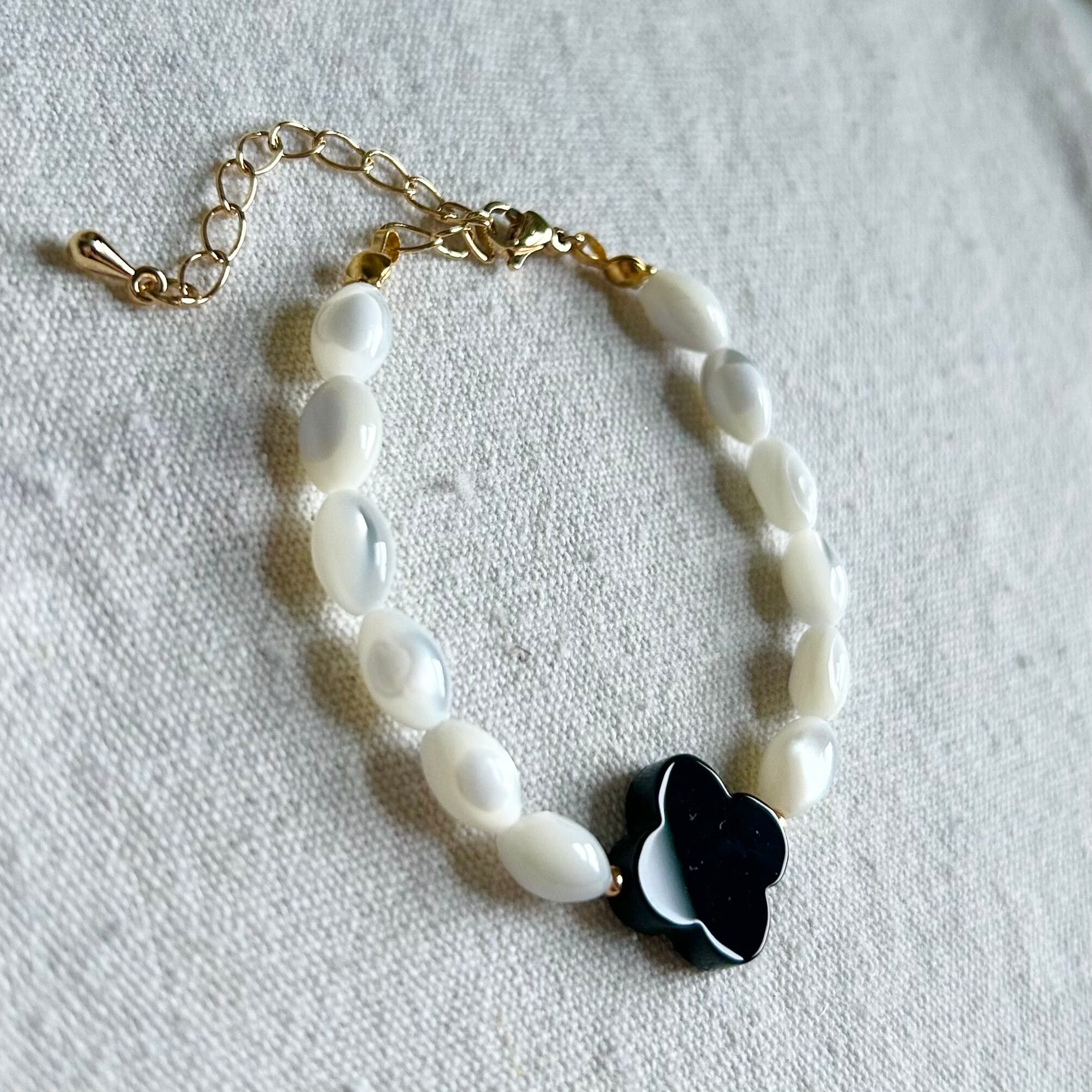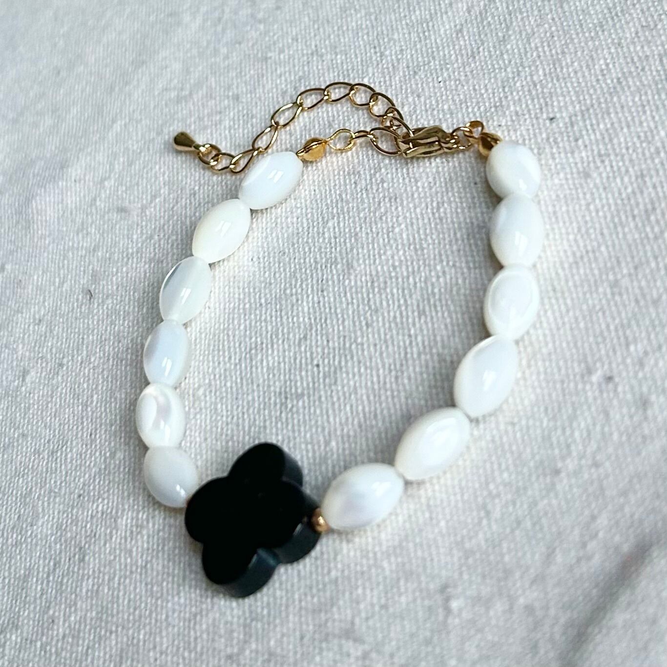 クローバーモチーフのブラックオニキスとやさしい輝きを放つマザーオブパールを使った大人フェミニンなブレスレット♪