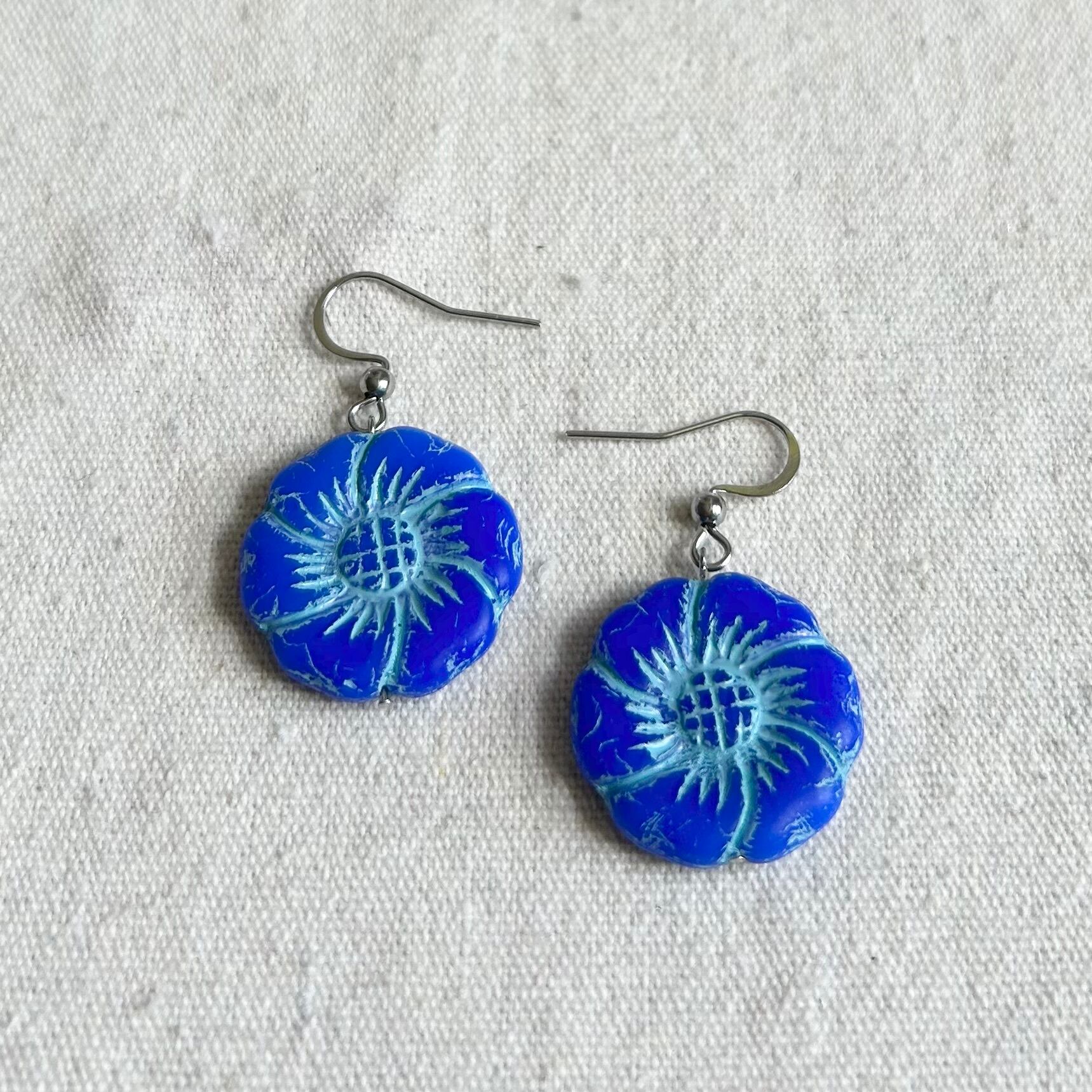 鮮やかな青い花に水色のラインがアクセントになった、かわいらしいピアスです。