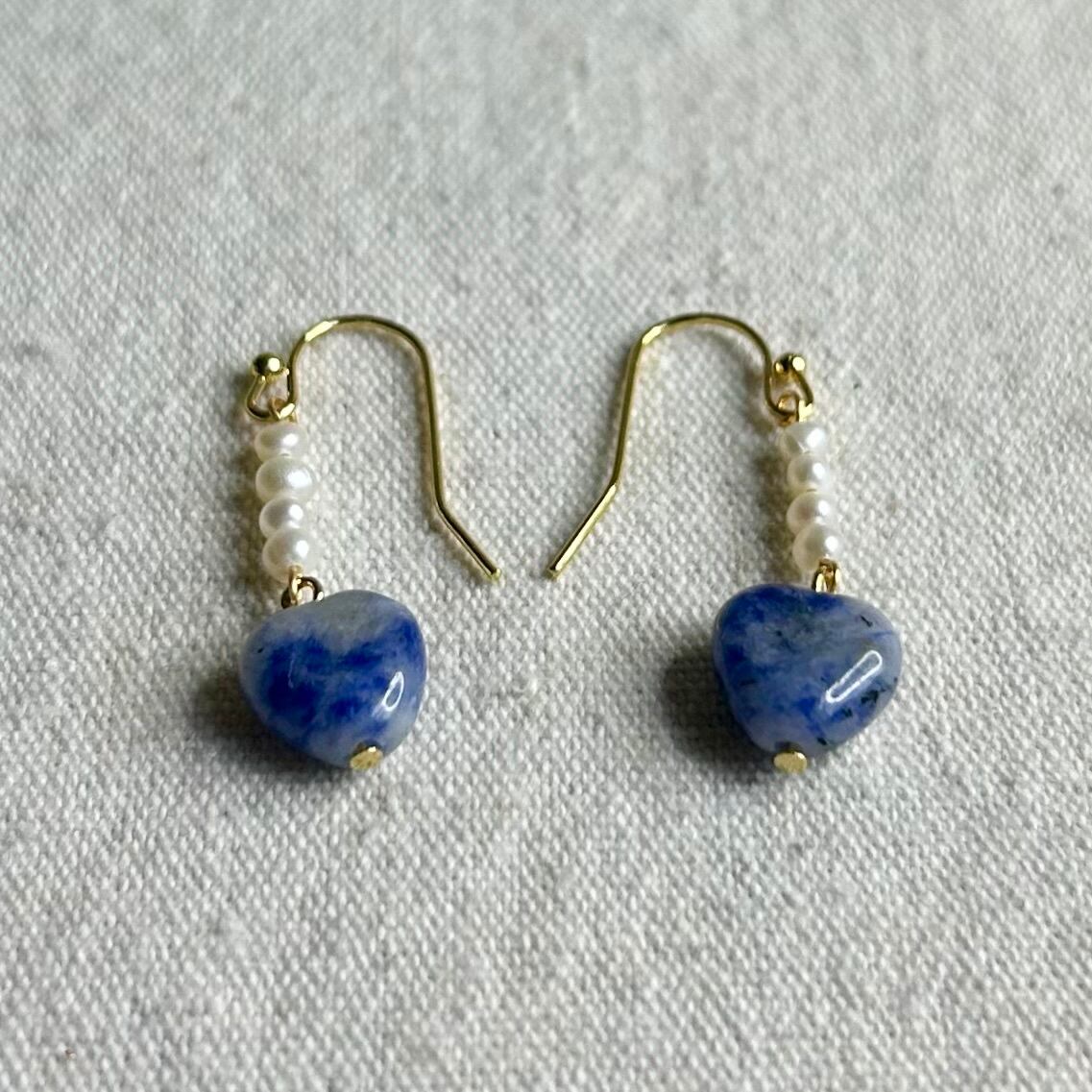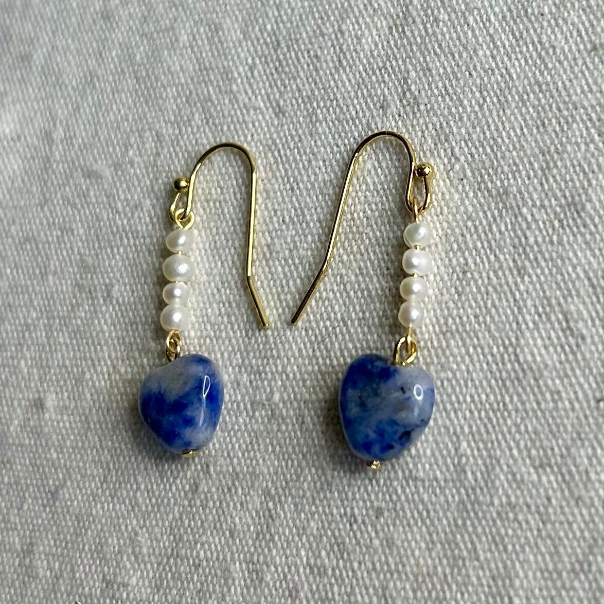 夏の空に雲が浮かんでいるような見た目のソーダライト・ハートチャームに、白い淡水パールを足したら、さわやかなピアスになりました♪