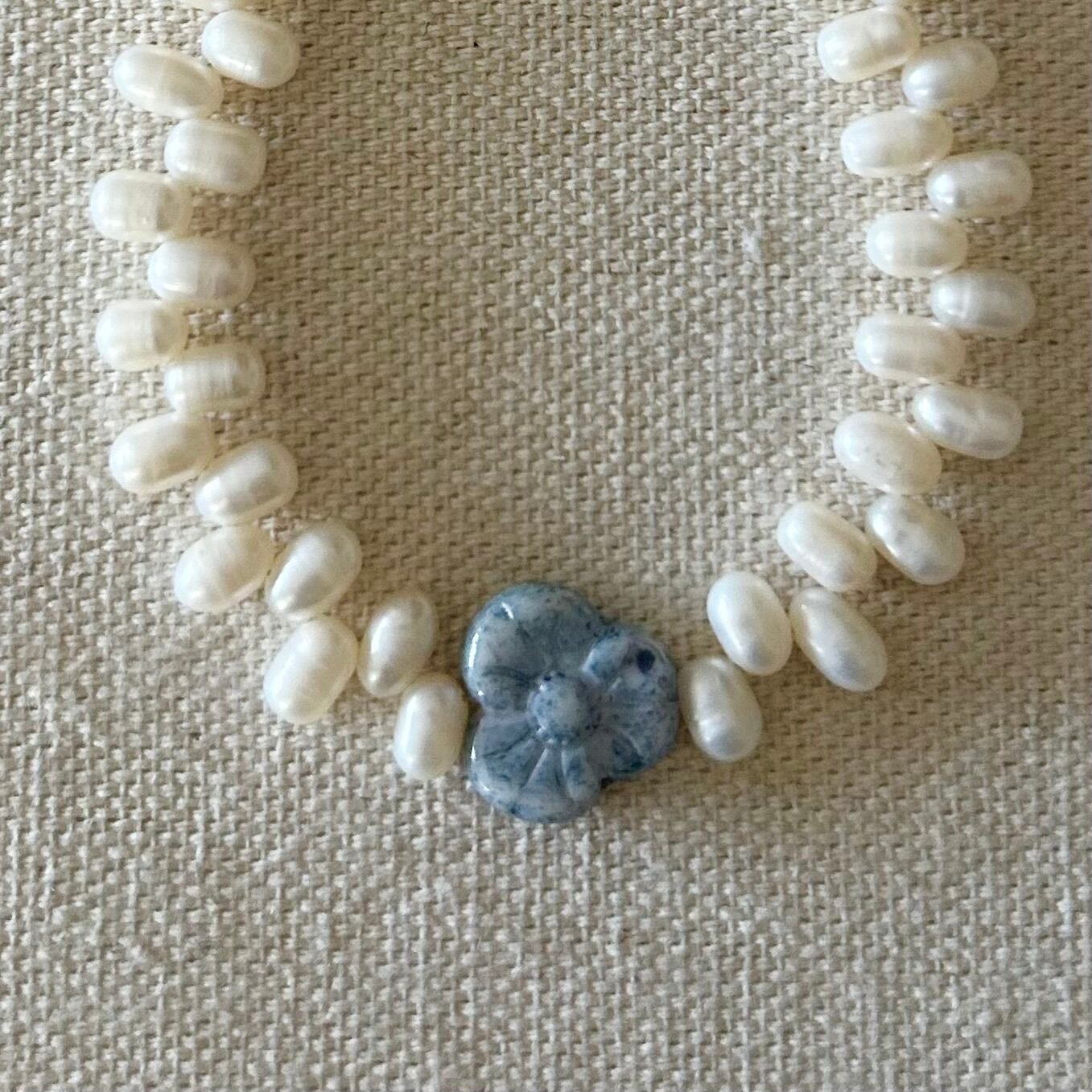 それなりの重みがある、ガラスチェコビーズのかわいらしいお花と、動きの出るクレオパトラと呼ばれる淡水パールを組み合わせて、存在感のあるブレスレットができました♡