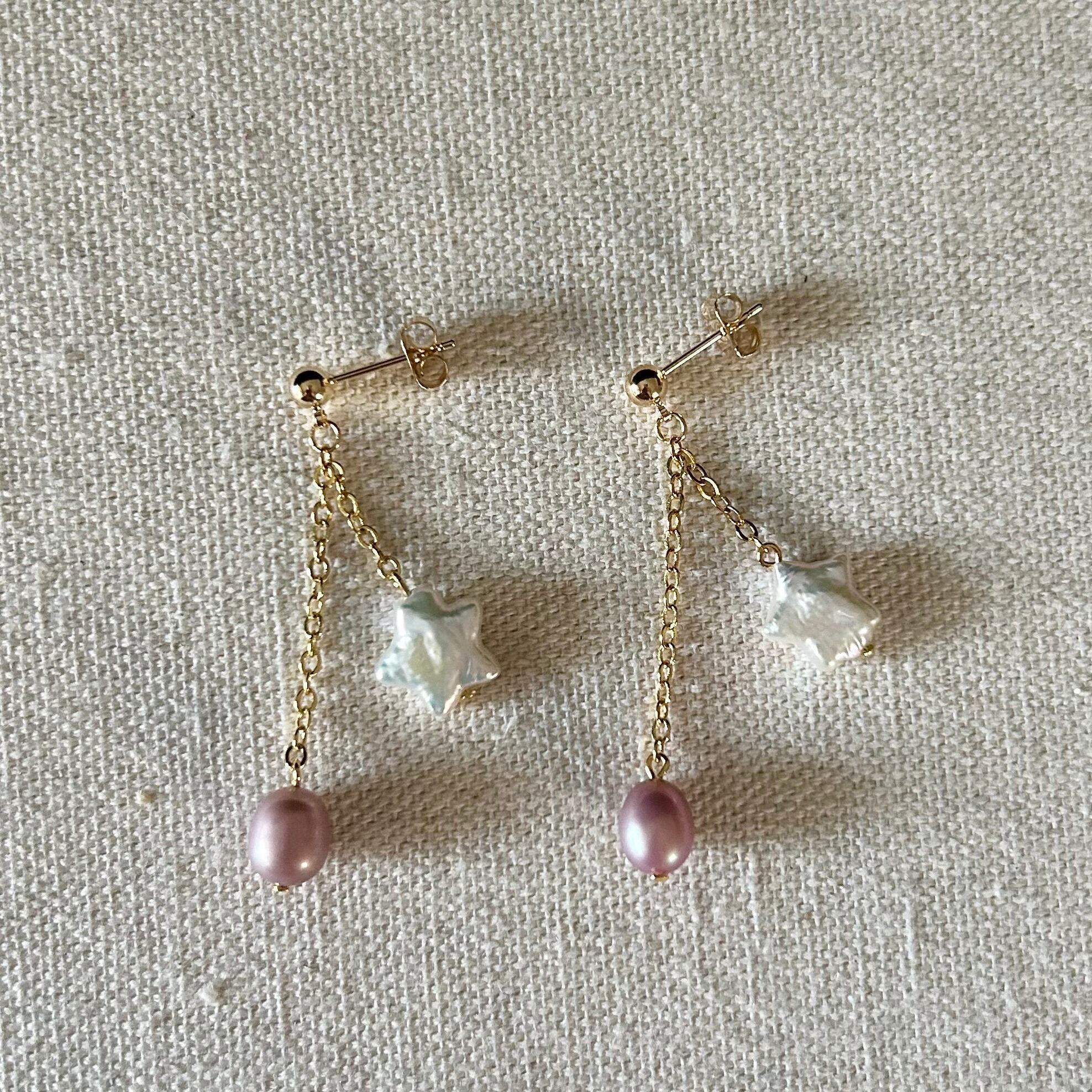 ♦Star Shaped & Purple Pearl Earrings: 18kgp hook & chain♦