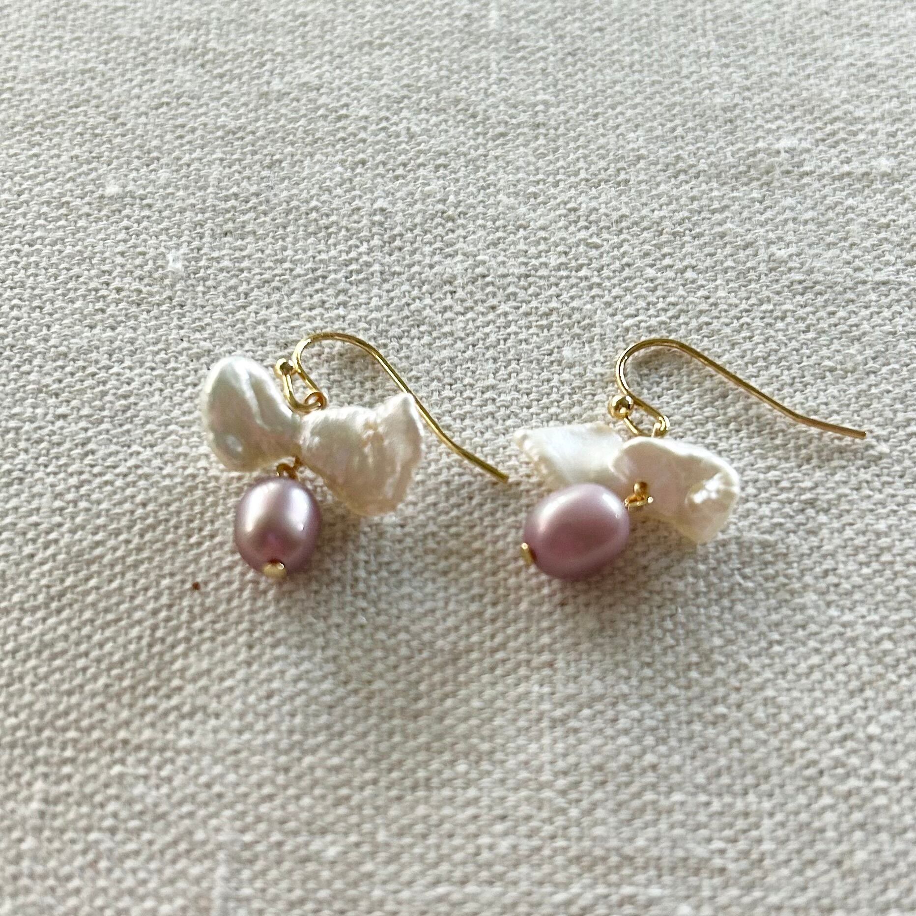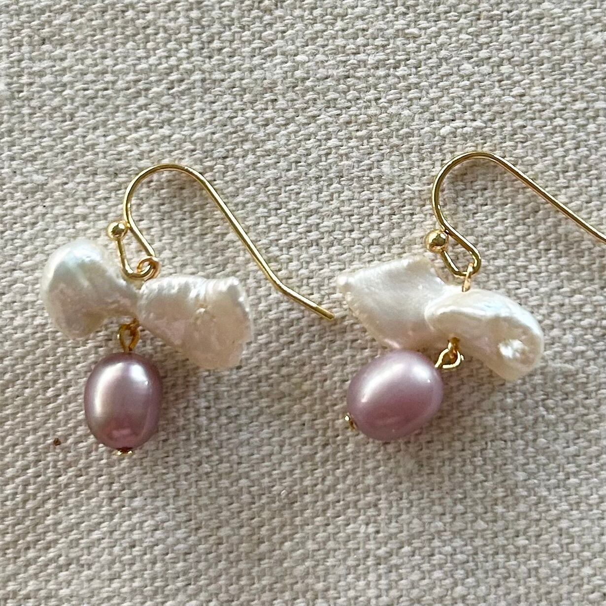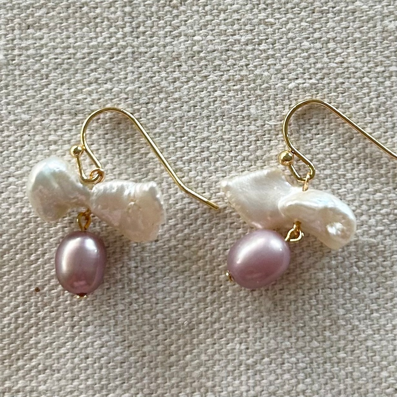 ♦Bow Shaped Fresh Water Pearl & Purple Pearl Earrings: 18kgp hook, 14kgf wire♦
